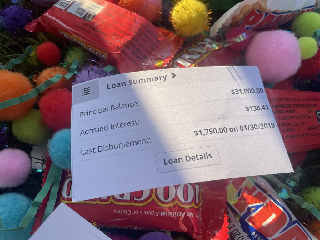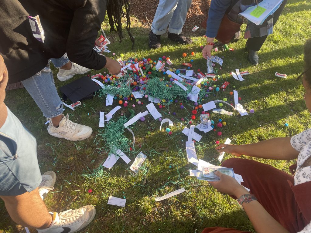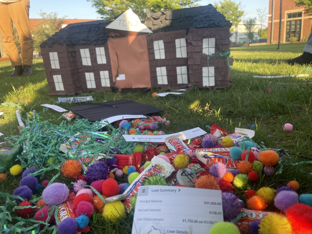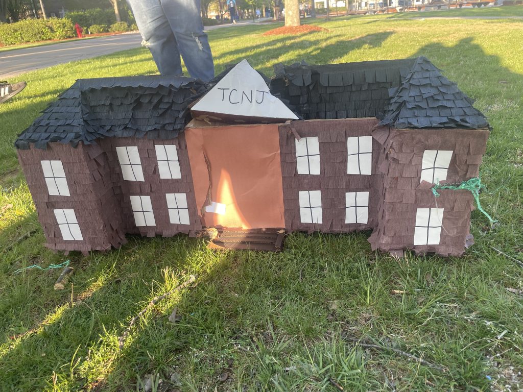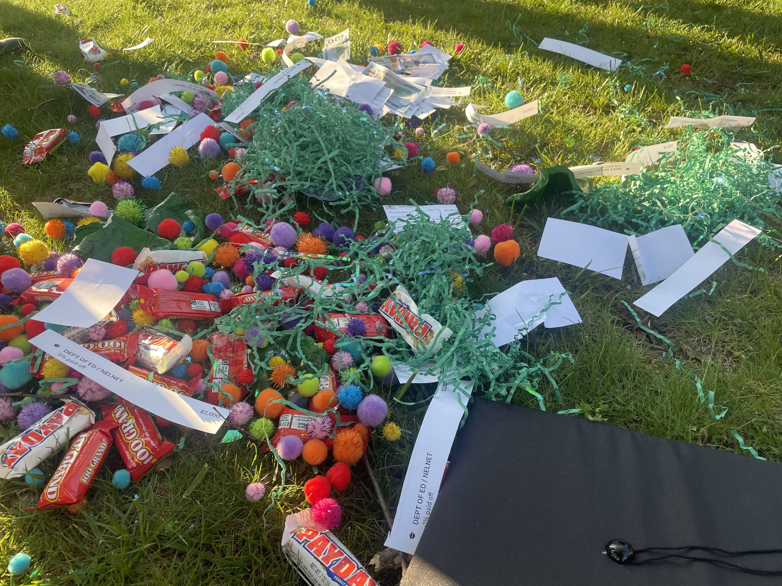 Graduation Piñata is an interactive performance piece. Graduating from college is a celebratory event, filled with congratulations and parties, but it also signifies the beginning of ‘adult’ life and the start of student loan payments. Partygoers are invited to participate by donning a graduation cap and hitting the piñata. The piñata is made to represent Green Hall, which houses the Administrative departments at TCNJ. Inside, partygoers found pompoms, confetti, pretend money, hundred grand and payday candy bars, and receipts of my own personal student loans totalling $31,000. The cost of a college education is high, and I will be paying it off for the rest of my life. Time to celebrate!
