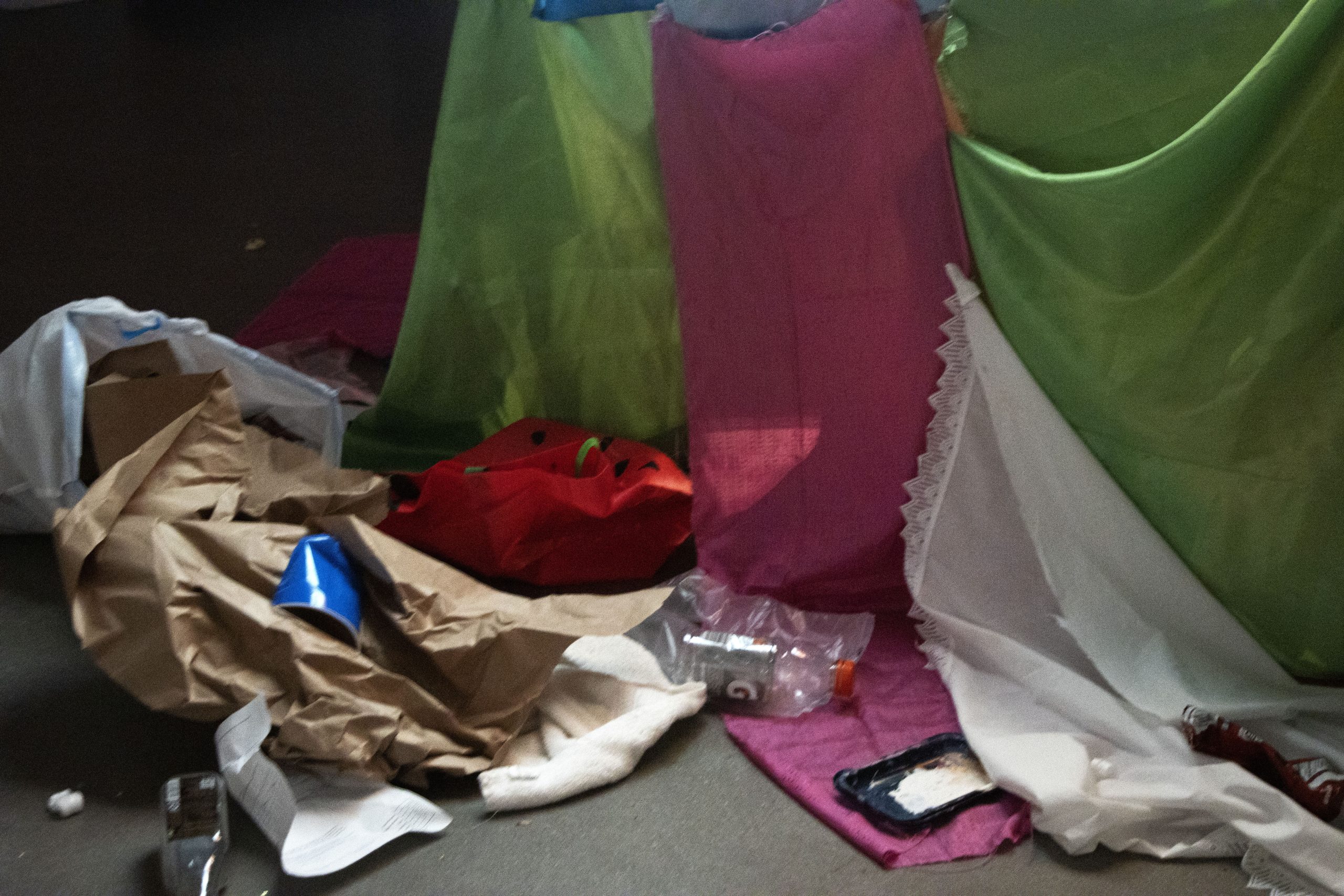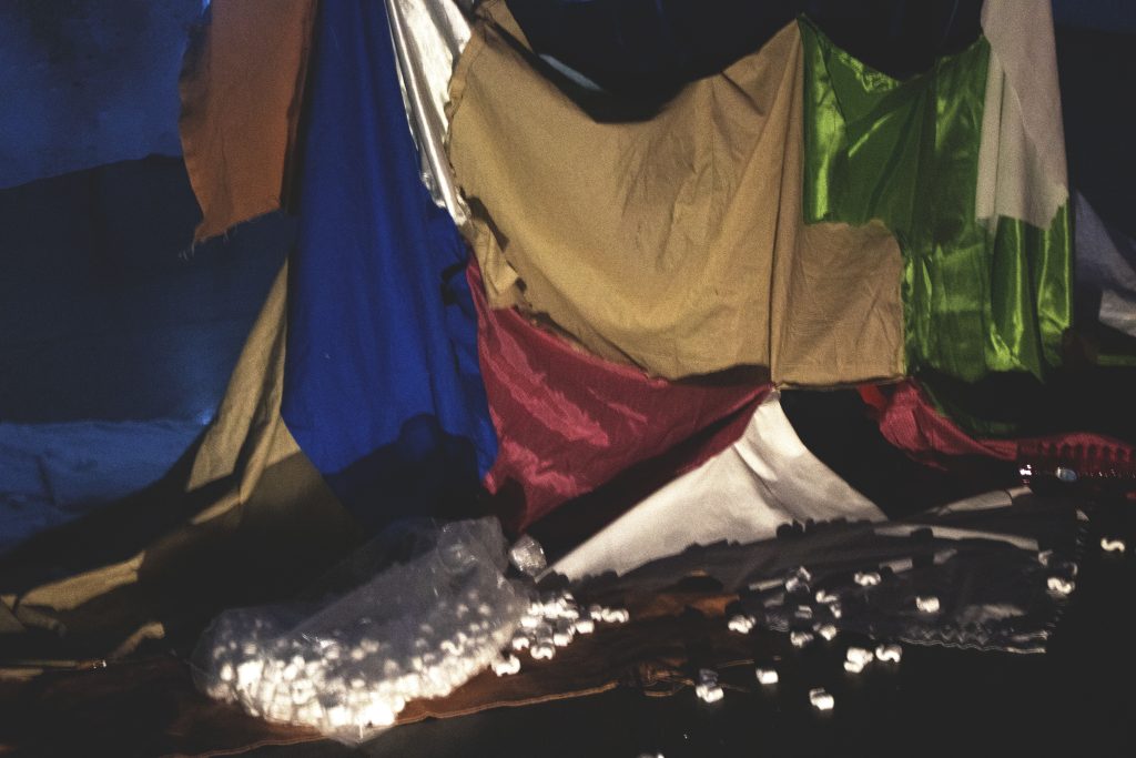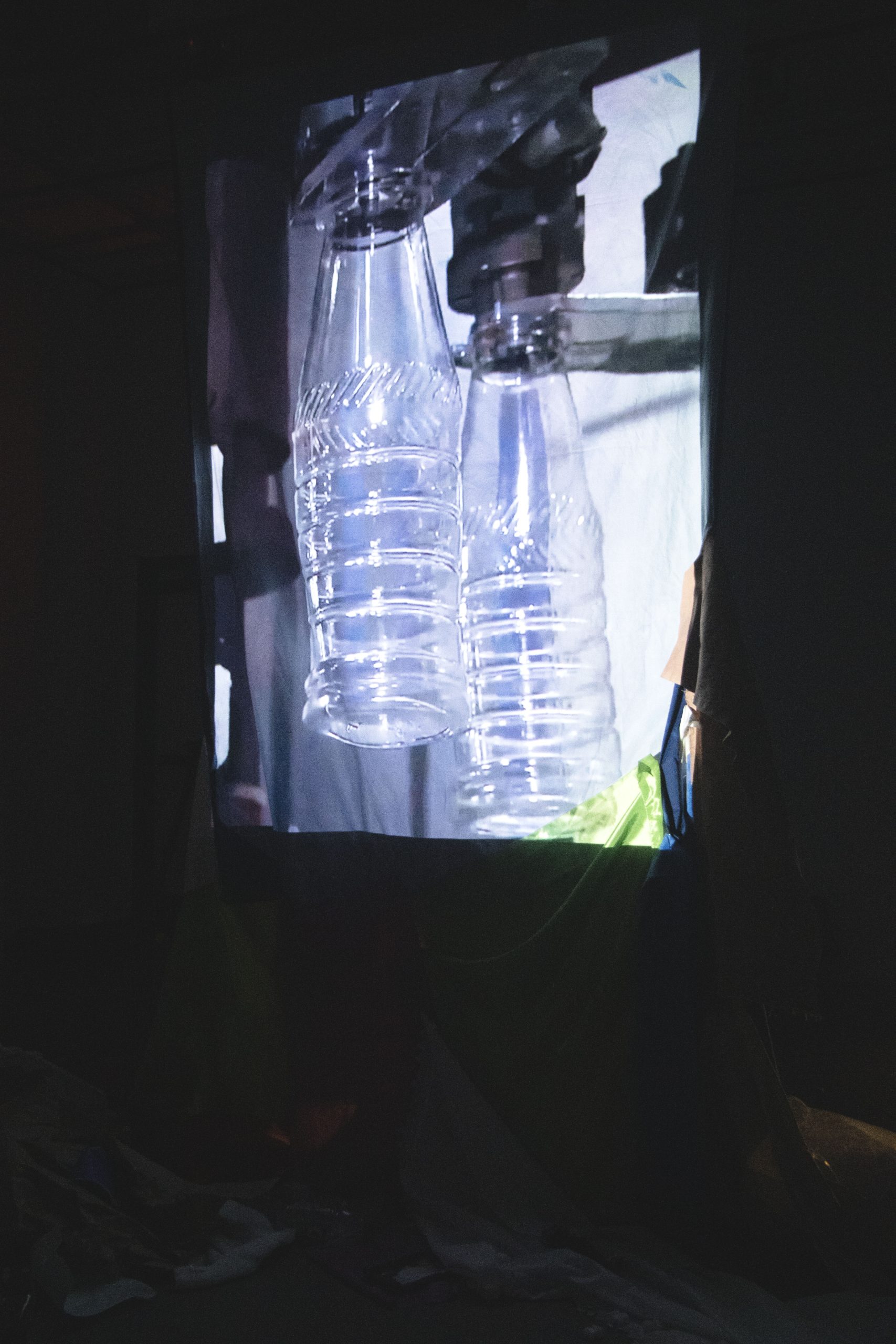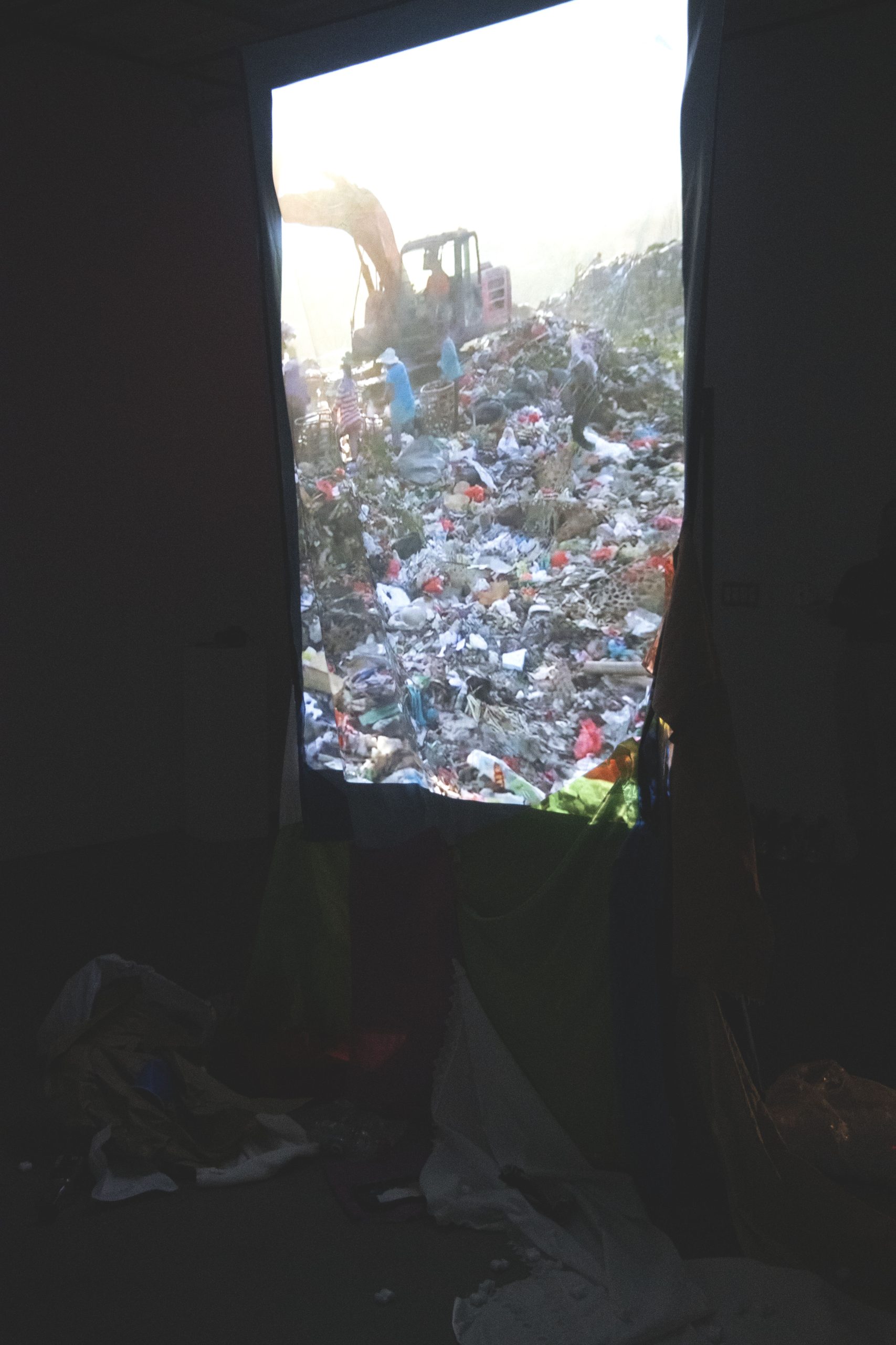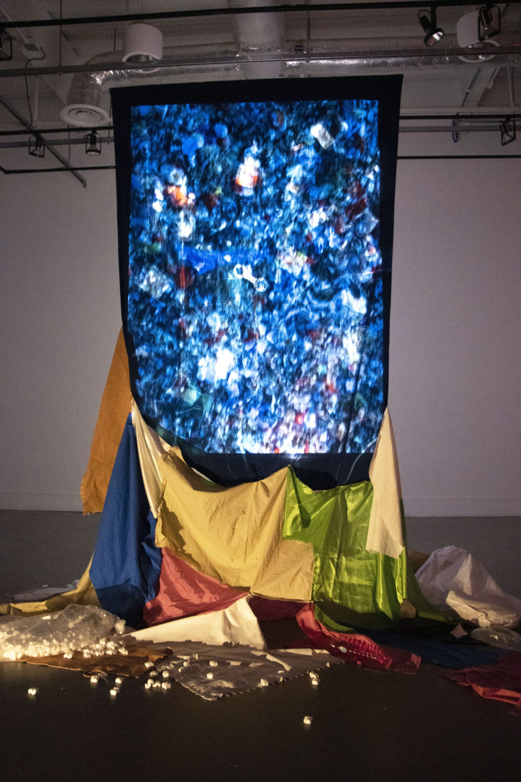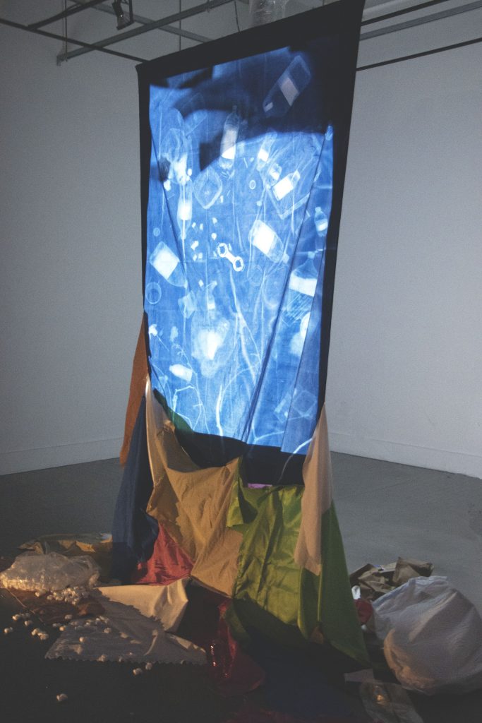 Landfill is an installation that brings environmental issues into the white cube. A large cyanotype hangs from the ceiling, silhouettes of plastic bottles and waste filling the composition, and cascades down into fabric scraps and various garbage strewn about. Video is projected through this screen of waste, playing footage of landfills and manufacturing warehouses. Mass produced single use plastics and fabric waste are killing our environment, and this project dumps those concerns onto the gallery floor.